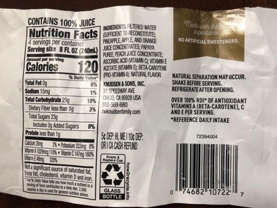 filtered water (sufficient to reconstitute); pineapple, apple, and orange juice concentrates; papaya puree; peach juice concentrate; ascorbic acid (vitamin c); vitamin e acetate (vitamin e); beta-carotene (pro-vitamin a); natural flavor.