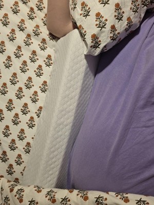 I originally bought this for more back support at 34 weeks pregnant, but I found it works great along the front of my body for breast and tummy support. I couldn't use a normal doughnut around the body pregnancy pillow due to dogs sleeping in my bed, and this has made it so there is still room in my bed and so I have additional support..debating on buying a second to have one infront and behind me!