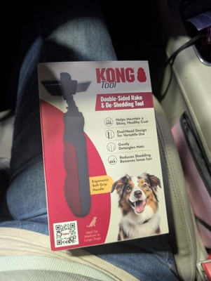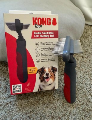 [This review was collected as part of a promotion.] The Kong double-sided rake and de-shedding tool is great for brushing out your dog. It has a non slip handle so you don't feel like it is gonna slide out of your hand. The rake side is very gentle on my dog and gets out the mats while brushing through the fur. The de-shedding blade is great for getting rid of the extra fur without ripping out your dog's fur. I love the Kong brand and would definitely recommend this product.