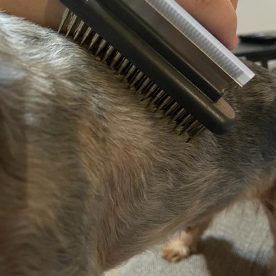 [This review was collected as part of a promotion.] The brush seems to function well enough. In particular I do like the de matting side of the comb, however I find the other side kind of ineffective, and my dog really hates it as you may be able to tell from the picture!! I would recommend for the mat removing side, but I think there are likely better options out there.