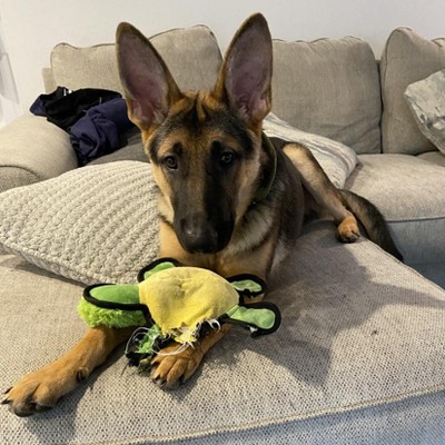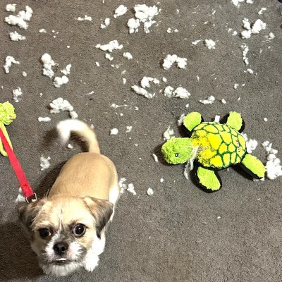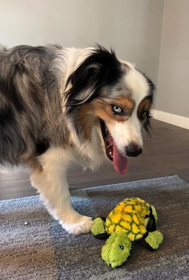 This toy outlived our dog and has been passed on to another family dog. Our dog was quite a chewer, easily tearing into stuffies within minutes. Somehow the Kong turtle made it through aggressive chewing and was her favorite toy. She would select it from her toy bin and throw it into the air. Caroline was probably not the most aggressive chewer compared to others, yet this toy lasted for at least two years — the ONLY one that she was unable to destroy!