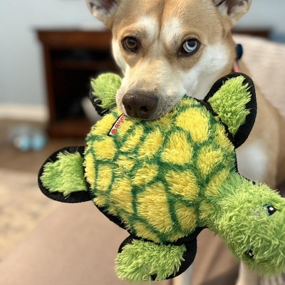 I have a 13 year old GSD with poor teeth, he no longer wants to chew but loves to cuddle and bite soft plush dog toys. I got this tutle for him and he loved it but within 3 hours he had poked a hole in the underbelly of the turtle. The materials used on the top and head/arms/legs is durable but the material on the underbelly is not the same, not durable, knit fabric and one of his canines went right thru it, enough of a hole that he'll pick at it and have the stuffings out in no time flat.