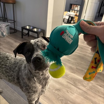 The KONG Wubba™ is a fun, interactive tug and toss toy that is great for interactive or solo play. Its long floppy tails are ideal for shaking and tugging instincts as well as games of fetch. A durable reinforced polyester exterior combines with unique ball shapes for play sessions that last longer. Dogs love to squeak the Wubba™ and add to the fun by shaking the flapping tails back and forth making every game different from the next.