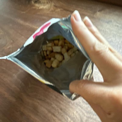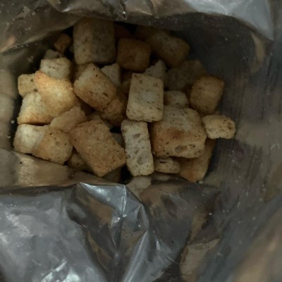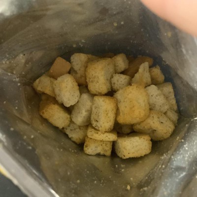 [This review was collected as part of a promotion.] I gave these croutons a try spotting them in the store and being intrigued by the simple, clean ingredient list and the fun branding. I like sourdough and I always have croutons on hand for my salads so these seemed like a good pick. The texture is definitely on the crunchy side. They held up well in my salad without getting soggy, and the seasoning was noticeable mostly salt. It was definitely on the salty side. Personally, I found them a bit too dry and not quite as flavorful other than the saltiness. They weren’t bad, but I don’t think they’ll be my go to croutons. I received an incentive to write this review.