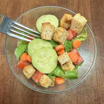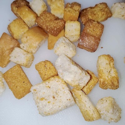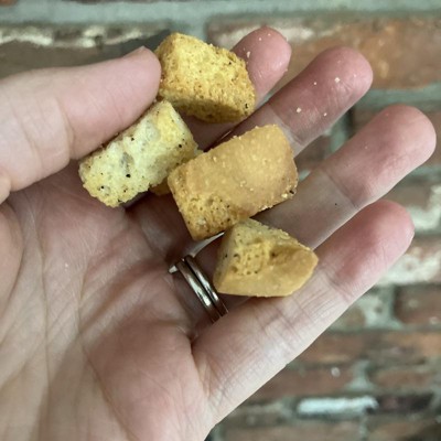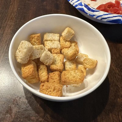 These croutons are a delightful addition to salads and other dishes, offering a satisfying crunch and a clean ingredient list. Guests appreciate their fresh taste, with many noting the enjoyable sourdough flavor. While some find them a bit salty, the overall consensus is that they enhance meals beautifully. Their versatility allows for use in soups and as snacks, making them a pantry staple for many families.