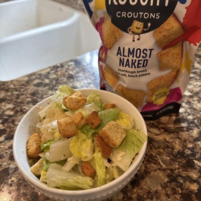 [This review was collected as part of a promotion.] These Kooshy Almost Naked croutons are delicious! They are super crunchy and taste very fresh. They are seasoned well and are the perfect additions to my salads. My husband and two picky toddlers liked them, too! I will say, the bag was only a little over half full of croutons when I opened it and the rest was air which was slightly disappointing but the taste made up for it. I received an incentive to write this review.