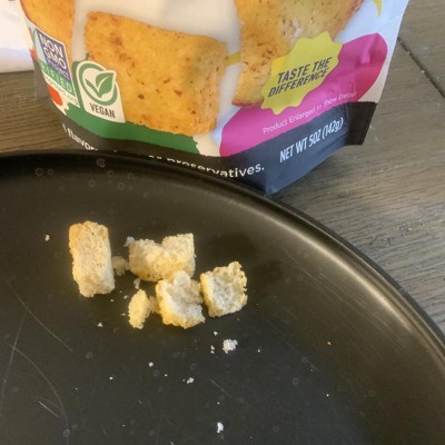 [This review was collected as part of a promotion.] We love these croutons! They have great, simple seasoning, a nice crunch, and are the perfect size. We find ourselves eating them straight out of the bag on many occasions! They stay fresh, and the ingredients are simple so I don’t feel bad about adding extra to our salads. I do wish they would come in a larger bag because we go through the smaller one pretty quickly. I received an incentive to write this review.