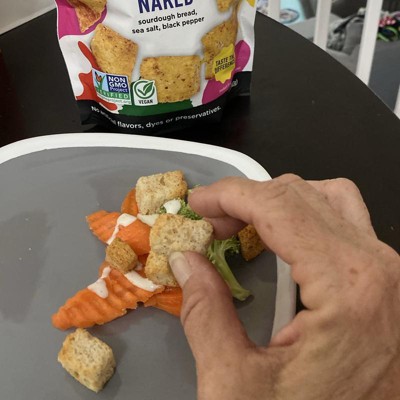 [This review was collected as part of a promotion.] These are the kooshy croutons in the flavor almost naked. They are made of a sourdough bread, sea salt, and black pepper. They definitely have an extremely muted flavor. These are great for a dish that is packed with flavor, so they don’t steal the show. The crunch is really delicious. I love that these are all natural and vegan, as well as non GMO. I am happy to serve these to my family. I received an incentive to write this review.