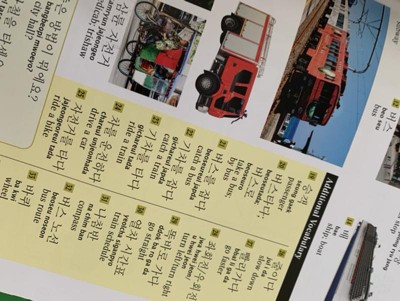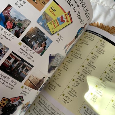 I like that this one has cultural knowledge, food is really korean dishes vs the standard in Dk dictionary which is not helpful. The currency also applies to the country. The downside to this is that it’s too big so you can’t carry it around when you travel.