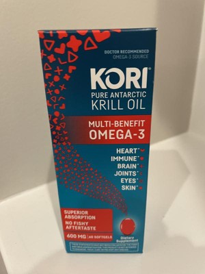 Most of us don’t get the recommended amount of Omega-3s because we don’t eat enough fish, but you can make getting your servings easy with multi-benefit Omega-3 600mg small softgels from Kori Pure Antarctic Krill Oil. Kori is the Ocean's Superior Omega with more nutrients in their most natural form to support you best heart, brain, joint, eye, skin and immune health.* Because Kori delivers Omega-3s in their most natural phospholipid form, it has superior Omega-3 absorption compared to fish oil.** This form also digests easily so there’s no fishy aftertaste, a common complaint with fish oil supplements. Kori also naturally has key nutrients you won’t find in fish oil, like choline to support brain and nervous system health and the antioxidant astaxanthin.* This Omega-3 supplement is made in the USA from wild-caught Antarctic krill, processed immediately on the boats to preserve freshness. Plus, Kori Krill Oil softgels are certified sustainable, gluten-free and dairy-free, and have no ethyl esters, artificial colors, flavors or preservatives added for a dietary supplement you can feel good about. It's a simple way to introduce an Omega-3 source into your diet. Krill oil is clinically proven to raise Omega-3 levels. This 60-count Omega-3 krill oil Supplement includes a one-month supply of easy-to-swallow small softgels.