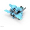 - The model’s main color scheme is light blue and light gray, with a Blastermetal core and clear and clear green for the canopy and visor. The kit also includes sticker decals to recreate the design from the illustration.