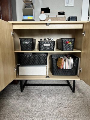 - The storage cabinet features adjustable interior shelves that make it easy to tuck away storage and organize the room. With two swinging doors, this cabinet offers plenty of hidden storage.