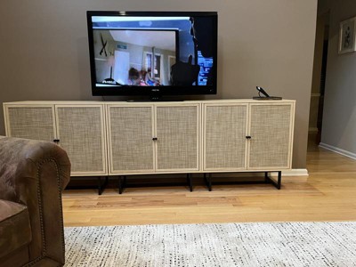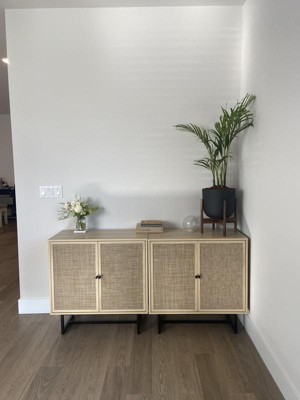 Kova is a beautiful hideaway storage cabinet piece that blends effortlessly in any room. The natural palette of this accent cabinet consists of light oak wood and rattan cane door fronts for a boho-chic accent piece. The sideboard features modern matte black metal legs with footpads attached to keep your floors from being scratched. With two cane swinging doors, this cabinet offers plenty of hidden storage and enough space to keep your home clutter-free, plus, you can adjust the shelves in the storage cabinet for the perfect amount of space.