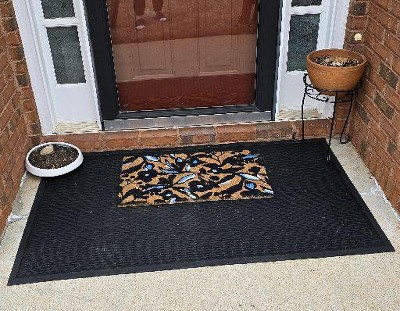 It's thick and hopefully won't get blown away by the wind which I had numerous issues with a thinner non rubber outdoor rug. Looks great at my front door.