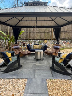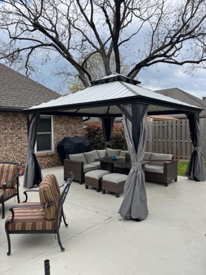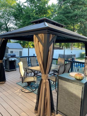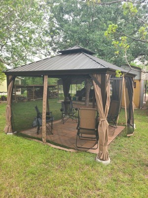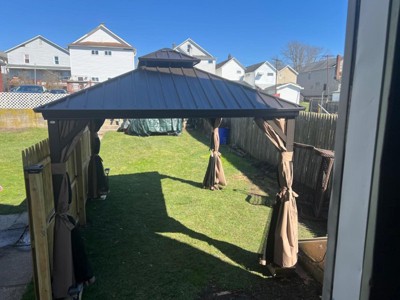 Okay, I have gotta rave about this gazebo because it is honestly exceeded my expectations. The dark brown aluminum frame looks sleek and feels crazy strong those 3.0"x3.0" triangular poles keep it steady as a rock, and no rust or bending even after months outside. The hard metal roof? Genius move. None of that flimsy fabric or plastic stuff,it is galvanized steel, rated for 2000 kg, so heavy snow is no match for it. I live where it dumps snow, and this thing does not even flinch. Then there is the PBV coated mosquito netting and the solid polyester sidewalls super tough, and I love that it comes with both. The double-track system is clutch, letting me layer up for privacy or just keep the bugs out. Oh, and the privacy curtain being fireproof AND waterproof? That is next-level thoughtful. It is built to last, and I am already telling all my friends to get one!