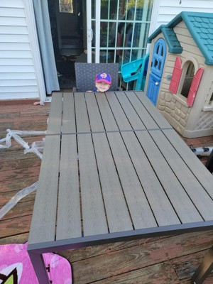 - STYLISH DESIGN: This table's design is a perfect fit for your patio, porch, backyard, balcony, etc. The wood-look tabletop matches your outdoor decor perfectly and comfortably seats 6 people.