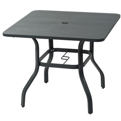 Kozyard D35.43" x W35.43" x H28.74" patio dining table, a perfect addition to your outdoor space. This table is ideal for those who enjoy meals outside. It comfortably accommodates up to 4 people, making it great for backyard barbecues, parties, or simply enjoying a cup of coffee in the morning. With its sleek design and durable construction, this table is a stylish and practical choice for your patio or deck. This outdoor dining table is both functional and stylish. The metal construction is sturdy and designed to withstand the elements, ensuring it will last for years. The square design adds a unique touch compared to traditional round tables. The tabletop features a wood grain texture, enhancing its visual appeal. Additionally, the table includes an umbrella hole, allowing you to add a patio umbrella for shade on hot summer days