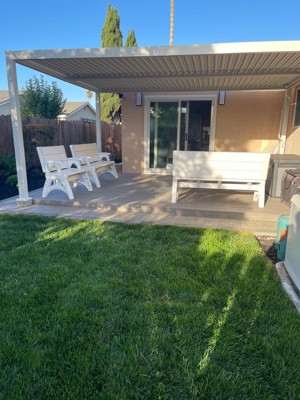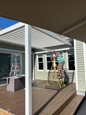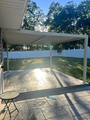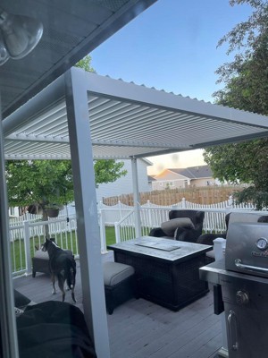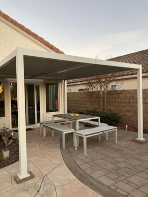 I purchased this 12x14 louvred pergola about a year ago. We installed it with 2 friends who were more hands on than myself. It gave a very beautiful and classy look to my courtyard. I have a table with fire pit under the pergola. So, we can use the space day and night, shine or rain. Very happy with this setup.