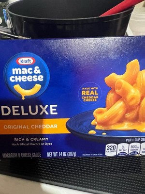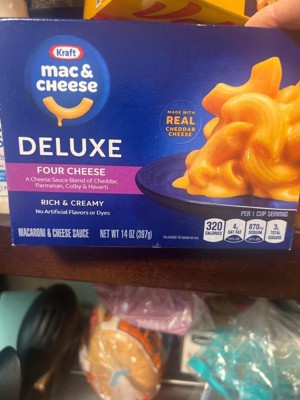 - KRAFT MAC AND CHEESE: One 14 oz box of Kraft Deluxe Four Cheese Mac & Cheese Macaroni and Cheese Dinner