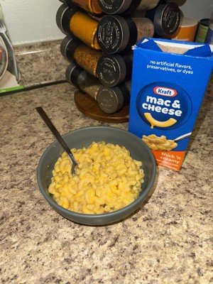 Help yourself to a bowl of comfort. Kids and adults love the rich taste of Kraft Thick 'n Creamy Mac & Cheese Macaroni and Cheese Dinner. Our 7.25-ounce mac and cheese box includes macaroni pasta and thick and creamy cheese sauce mix, so you just need milk and margarine or butter to make tasty mac and cheese kids love. Our warm, cheesy macaroni goodness fills your belly and feeds your soul. With no artificial flavors, preservatives or dyes, Kraft Macaroni and Cheese is always a great choice for family dinners. Looking for quick meals, sides or kids meals? Our beloved Blue Box mac and cheese brings easy meals together. Simply boil water, stir in macaroni and cook 8-10 minutes. Drain the macaroni and return to the pan. Then add margarine or butter, milk and cheese sauce mix, and mix well. Stir up new ways to enjoy Kraft Mac n Cheese by adding protein or seasonings to make it your own. Try crispy bacon, shredded rotisserie chicken, steamed broccoli, hot sauce, and more! A wholesome tradition, Kraft Mac & Cheese has been bringing generations together since 1937. Kraft Mac & Cheese inspires the positive power of comfort, so stock up with our 4 pack of dinner sides and enjoy cheesy goodness anytime.