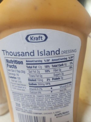 Kraft Thousand Island Dressing uses delicious ingredients for a rich, creamy topping perfect for salads, sandwiches, burgers and more. Our thousand island dressing contains no synthetic colors and no high fructose corn syrup or artificial flavors for a great dressing option. Made with chopped pickles, dried onions, paprika extract and mustard flour, this thousand island dressing has a creamy, tangy flavor that perfectly complements coleslaw or burgers. Top an entree salad with this Thousand Island dressing or bite into a mouthwatering Reuben with our flavorful sandwich dressing on top. Each 16 fluid ounce bottle of dressing has 16 servings, so you can make meals for the entire family or prepare many individual servings.