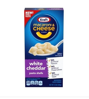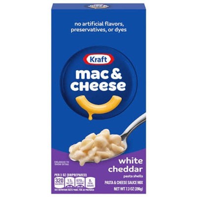 - KRAFT MAC AND CHEESE: One 7.3 oz box of Kraft White Cheddar Mac & Cheese Macaroni and Cheese Dinner