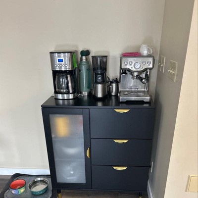 Create a stunning storage space for all your dining items with the Kragen Buffet Storage Cabinet from Buylateral. The sleek black finish and gold-tone hardware brings added sophistication to any dining room. Featuring a tempered frosted glass cabinet door that provides room for various size serving pieces with the two adjustable shelves. Three drawers are the perfect solution for stowing away your flatware, table linens, dining accessories and more. Constructed of MDF and pine wood legs which are handsomely accented with gold-tone metal finish leg brackets.