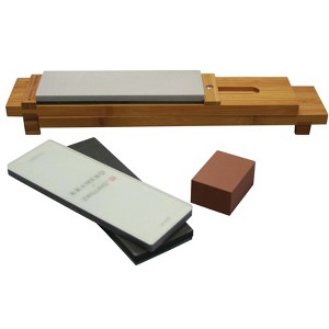 - Set includes 400-grit, 1000-grit, and 5000-grit glass sharpening stones, bamboo sharpening stone sink bridge, and Bob Kramer instructional DVD