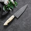 Made in Japan, these exceptionally durable knives are made with an SG2 super-steel core and are hand-finished using a traditional three step process. The cryogenic ice-hardened, 11° angle blade offers scalpel-like sharpness and will stay sharper, longer. Featuring an exquisite 101-layer, deep-etched chevron Damascus pattern, these revolutionary knives are true works of art. Boasting a smaller blade profile, these knives are perfect for smaller hands. The lighter weight provides increased nimbleness, ergonomics, and comfort while maintaining strength and balance. The white, linen micarta handle resists wear, even after prolonged use. And the signature decorative center pin is handcrafted by Bob Kramer. Contemporary and elegant, ZWILLING Bob Kramer knives are an indispensable addition to any kitchen.