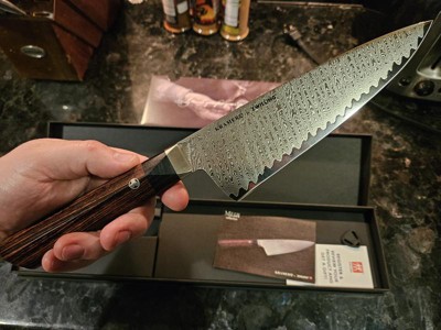 I have been using my previous zwilling chef knife for over 10 years and was looking to upgrade and treat myself. This knife did exactly that. Its both beautiful and versatile. I have longer fingers which the handle perfectly fits with its d-shape. The edge holds well with good maintenance, but not as finicky as most Japanese knifes. VERY happy with this one