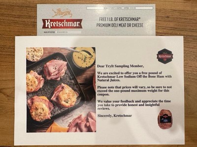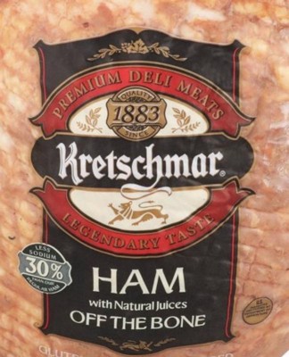 - One deli-sliced package of Kretschmar Premium Deli Off The Bone Lower Sodium Ham