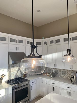 Love these pendants! They call them “mini� pendants but they're actually quite large. Three of them fill our 8 1/2 foot island and 12 foot ceilings perfectly. Just what I was looking for!