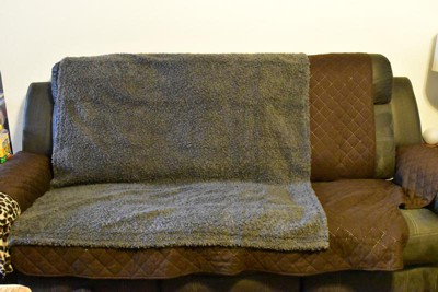 This blanket is super soft. It's heavy and durable. I got the smaller of the two sizes, and as you can see, it doesn't cover my whole couch. That's fine, the spot that it doesn't cover, is where I sit. It covers the part where the dogs lay, which is what matters most. But if you purchased the bigger size, I imagine it would cover the whole couch. I've tried several different covers to use on my couch. You can see the brown one underneath the blanket. It's supposed to be waterproof. It's definitely not. But this blanket is. 100%. If the dogs have an accident or puke, I don't have to worry about the mess soaking through into the fabric of my couch. As you can see from the video, the liquid just sort of... pools up. Which would make it very easy to clean up, if you're quick enough. I can't praise this blanket enough. It's a high quality blanket and it does it exactly what it says it will do. You could easily use this blanket for yourself. It's that nice. And it would also be perfect if you have messy kids. It's an amazing blanket and well worth the price.