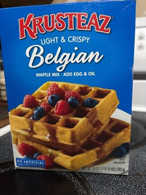 Krusteaz Belgian waffle mix makes great fat Belgian waffles that taste like I’m eating at a hotel or restaurant. The price for a box is not too expensive and worth having something delicious on your plate for breakfast lunch or dinner .