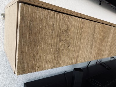 Not at all as described or shown in the pictures. The item is very dark in color with a rust-like look, not the light and classy style advertised. Even a professional had trouble mounting it. Very hard to hold in place, even with studs. The back is extremely delicate with just a thin layer that feels fragile and cheap. There’s hardly any space to push the wires, and it’s impossible to hide wiring at all. This is supposed to be a TV floating stand, but it’s more of a “museum piece” than a functional product. On top of that, I paid extra money for installation, a complete waste of both money and time. The worst part is you don’t really discover all these issues until you unbox and try to fix it. Overall, worst purchase ever. Would never recommend to anyone.