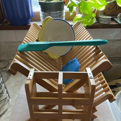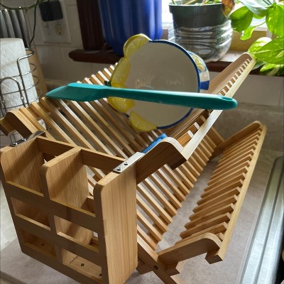 KTMBDW Bamboo Dish Drying Rack, 2 Tier Collapsible Dish Rack with Utensil Holder, Wooden Dish Drying Rack for Kitchen Counter, Dish Drainer, Natural