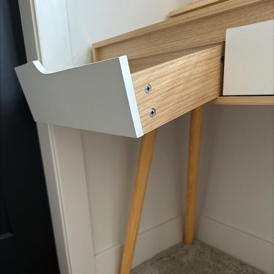 The legs are not the same color ad the table as well as not 100% clear on instructions and the drawers hang they dont have any rails on it