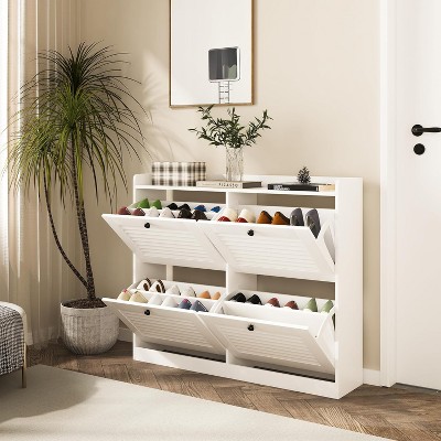 KTMBDW Modern Shoe Storage Cabinet with 2 Flip Drawers, Freestanding Organizer with Solid Wood Legs for Entryway, Narrow Shoe Rack Cabinet, White