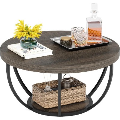 KTMBDW Round Coffee Table, 31.7" Wooden 2-Tier Circle Coffee Table with Storage Shelves, Modern Cocktail Table Center Table for Living Room, Gray