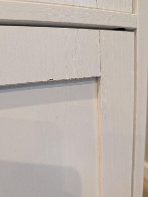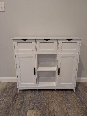 I ordered this for storage in my den. It arrived in less than a week and was packaged well. It took about two hours to assemble - kind of a pain. It also seemed to have smudges and paint chipped in spots. It does seem pretty sturdy. It's smaller than what the photo makes it appear, so that's a bummer. It came with little white stickers to put over the screws, which makes it look cheap. I really didn't have super high expectations, but I still feel a little disappointed.