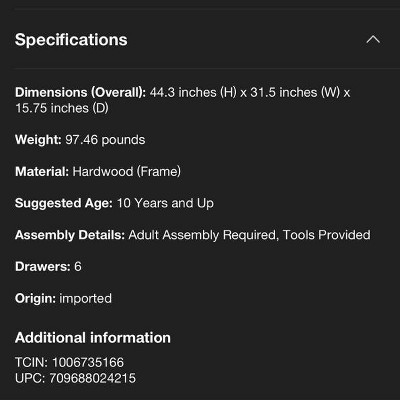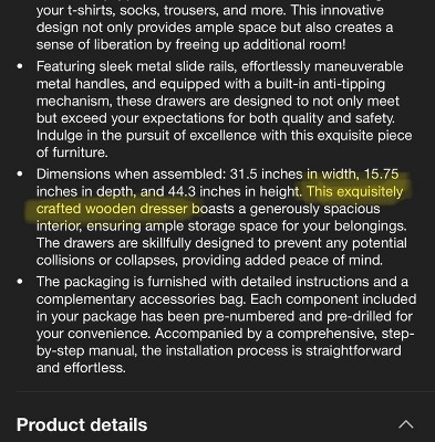 Dresser description states that the frame is hardwood. It is not. This entire thing is engineered wood just like any generic piece of furniture you buy anymore. Although it looks beautiful, the description is incredibly misleading and won’t hold up over time
