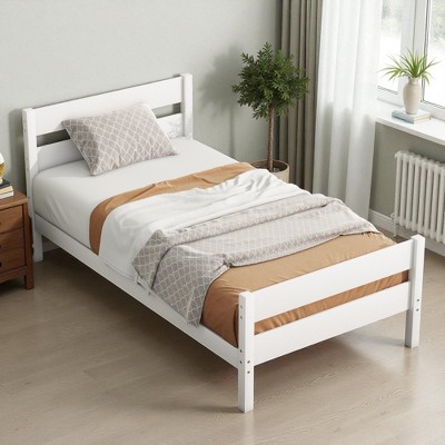 KTMBDW Twin Size Wood Floor Bed with Door & Fence, Montessori Bed Frame with Safety Guardrails & Door, Wooden Montessori Floor Bed for Kids (White)
