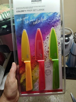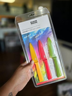 [This review was collected as part of a promotion.] Introducing the Kuhn Rikon Colori Knife Set, featuring three vibrant knives in yellow, red, and green. This set includes both straight and serrated paring knives, perfect for all your kitchen cutting needs. The blades are made of high-quality stainless steel and the handles are made of durable plastic for long-lasting use. They are very sharp and do not require long intervention for sharpening.