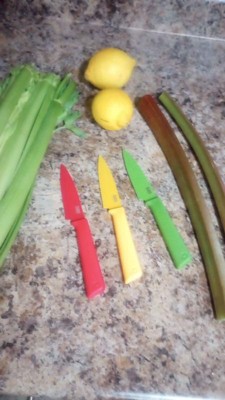 [This review was collected as part of a promotion.] 3 paring knives The knives are 3 different colors: red, yellow and green. The handles are made of plastic and the blades are painted metal. When holding to the light you can see the blade is about an inch into the plastic handle and there is very little side ways flex. The knives are very sharp, I cut through cardboard with each knife and then cut potatoes and meat. I also noticed that the potatoes and meat did not stick to the blades, each cut fell to the counter. I've cut into frozen pork and the knife is still sharp. The green knife has a straight blade and the yellow and red have different sized serrated blades. Each knife has a protective cap.