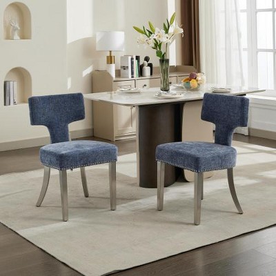 Kumasinova Dining Chairs Set of 2 with Silver Brushed Stainless Steel Legs,Chenille Kitchen Chairs with Curved Back&Copper Nails,Blue