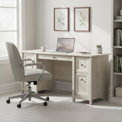 This compact and stylish home office desk set combines functionality with a modern design. Featuring a 47.25" wide tabletop and a deep modesty panel, the desk is finished on all sides—making it perfect for any room placement. The matching detached file cabinet is mounted on locking casters, allowing it to be easily rolled out for additional surface space or tucked neatly underneath the desk.