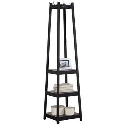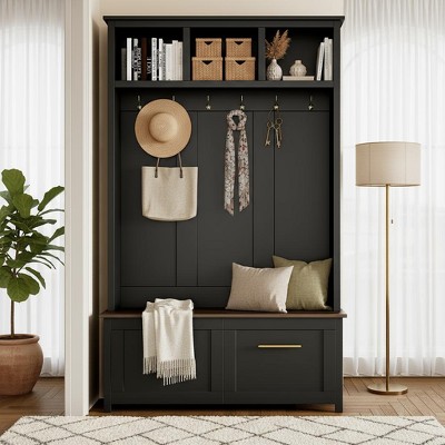 Kumasinova Modern Hall Tree with Metal Hooks,Entryway Coat Rack Freestanding with Shoe Bench,Clothes Rack with Shelves for Corridor,Black