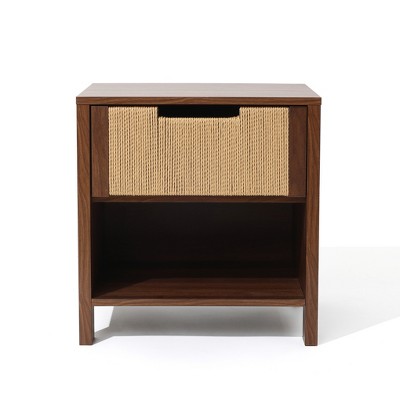 Kumasinova Rattan Woven End Table with Drawer, Modern Bedroom Nightstand, MDF Square Side Table for Living Room, Small Table with Open Shelf, Natural
