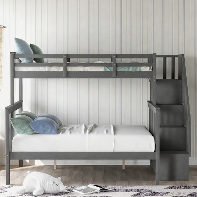 Kumasinova Twin-Over-Full Bunk Bed with Twin Trundle, Slanted Ladder & Guardrails – Gray Pine Wood Trundle Bed Frame, Convertible (Splits to 2 Beds)