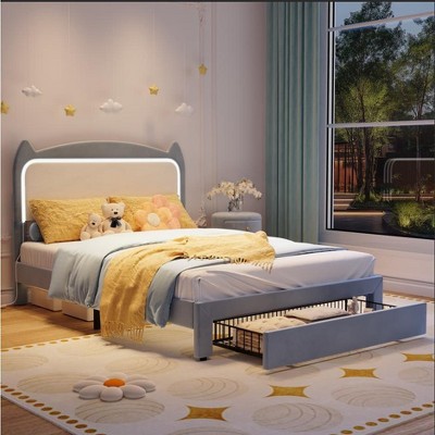 Kumasinova Upholstered Full Size Bed with Headboard, Shelves & 2 Under-Bed Drawers, Wood Platform Bed Frame, Storage Bed Frame, Gray